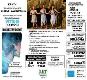 Endlich! Nach über einem Jahr harter Arbeit wird es Ende Juli 2016 soweit sein. Vom 25.07. 03.08.2016 findet in einer seltenen und außergewöhnlichen, schönen Location, nämlich der Bastion am Hafen von Heraklion, die internationale Ausstellung „Minoan Civilization My Inspiration“ statt. Gleichzeitig wird digital und auch live diese Ausstellung in u.a. Paris zu sehen sein. Initiatorin ist die großartige Komponistin, Regisseurin und Künstlerin Vivian Roussakou. J.Kühn ist stolz auf die Ehre dieses große Projekt mit Design zu unterstützen und gleichzeitig auch als Künstlerin mit eigenen Werken vertreten zu sein.