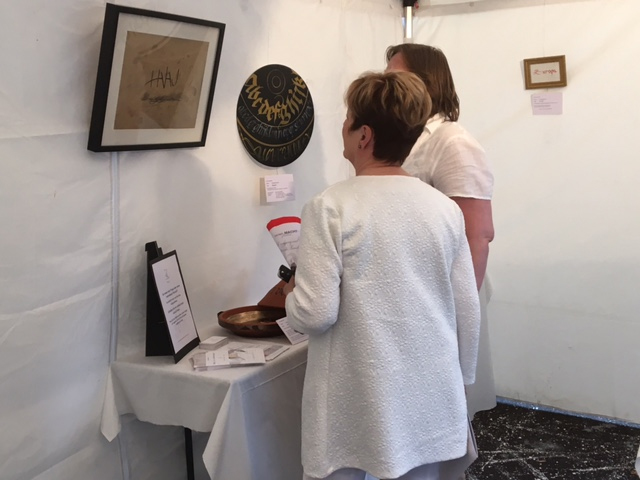 Man erzählte mir von dem Konzept des Kulturabends, in dem mehrere Künstler gleichzeitig das Publikum an einem Abend begeistern.Das Ganze in der einmaligen Atmosphäre des Fronhofs. Man fragte mich gleichzeitig, ob ich Lust und Zeit hätte.Ich dachte mir: "Versuchs einfach mal".Mir wurde ein großes Galeriezelt gegenüber der Bühne bereitgestellt. Dort gestaltete ich eine Vernissage mit ausgewählten Kunstwerken auf die Beine, die zum Thema des Bühnenprogramms passten. Bei den Werken war es mir wichtig, mich nicht nur auf Papier zu beschränken.Ich wollte den Gästen zeigen, wie vielfältig Kalligraphie sein kann.Wer hätte gedacht, dass der Andrang so riesig werden würde? Gleichzeitig gab es eine Live Aktion von mir, an dem jeder Besucher eine kleine Kalligraphie von mir erhielt. An meinem Stehpult kalligraphierte ich live den Vornamen der Gäste in eine Mini-Schultüte, wer denn wollte. Diese Schultüte für Erwachsene, stand unter dem Motto: Bildung Macht glücklich - Wert Schätze die Kunst Freiheit. Auch die Tüte war stimmig zum Bühnenprogramm angepaßt. Um es kurz zu machen: Der Andrang war so immens, das ich es in der gegebenen Zeit nicht schaffte, allen Gästen eine Tüte zu überreichen. Wer wollte, hatte aber dann die Möglichkeit, eine bei mir nach zu fordern. So waren alle zufrieden. Auch Fragen stellen und über die Schulter schauen war erwünscht und wurde sehr gut genutzt.